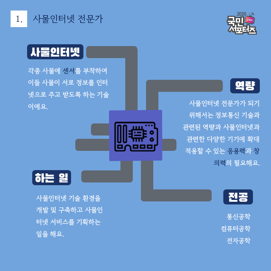 사물인터넷 전문가는 각종 사물에 센서를 부착하여 인터넷으로 사물들이 서로 정보를 주고받도록 하는 기술 환경을 개발 및 구축하고 사물 인터넷 서비스를 기획하는 일을 합니다.