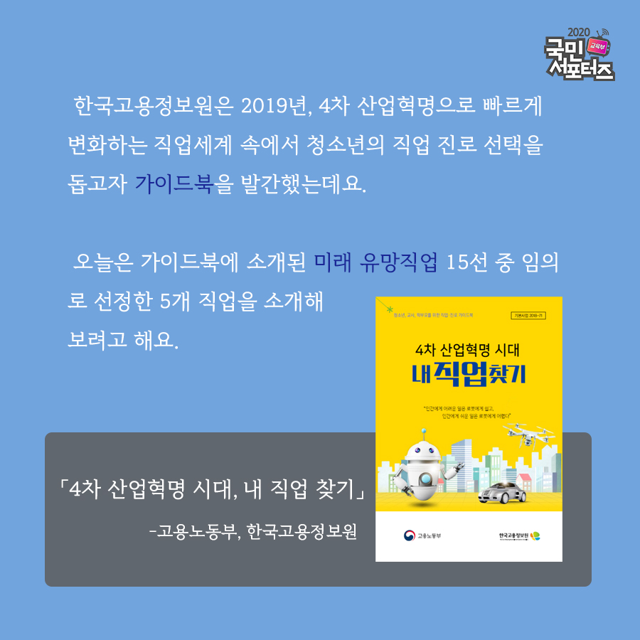 한국고용정보원은2019년 빠르게 변화하는 세계 속에서 청소년의 직업‧진로 선택을 돕고자 「4차 산업혁명 시대,내 직업 찾기」를 발간했습니다.소개된 미래 유망 직업15선 중에 임의로 선정한5개 직업을 소개하겠습니다. (다른 직업에 대한 내용은 한국고용정보원에서 확인해 주세요!)
