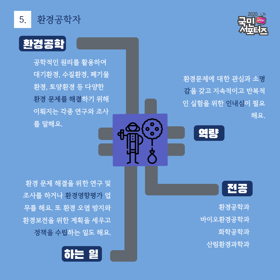 환경공학자는 공학적인 원리를 활용하여 다양한 환경 문제를 해결하기 위해 각종 연구와 조사를 하거나,환경영향평가를 진행합니다.또 환경오염 방지와 환경보전을 위한 계획을 세우고 정책을 수립하는 업무도 합니다.