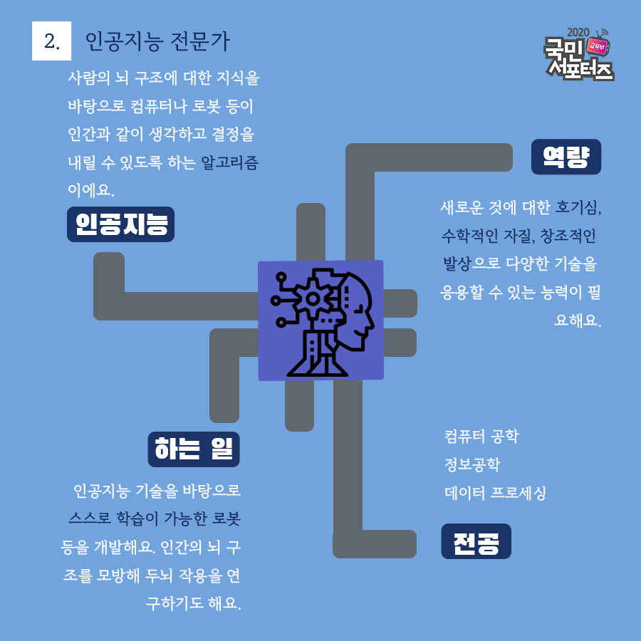 인공지능 전문가는 사람의 뇌 구조에 대한 지식을 바탕으로 컴퓨터나 로봇 등이 인간과 같이 생각하고 결정을 내릴 수 있도록 알고리즘을 개발하는 일을 합니다.