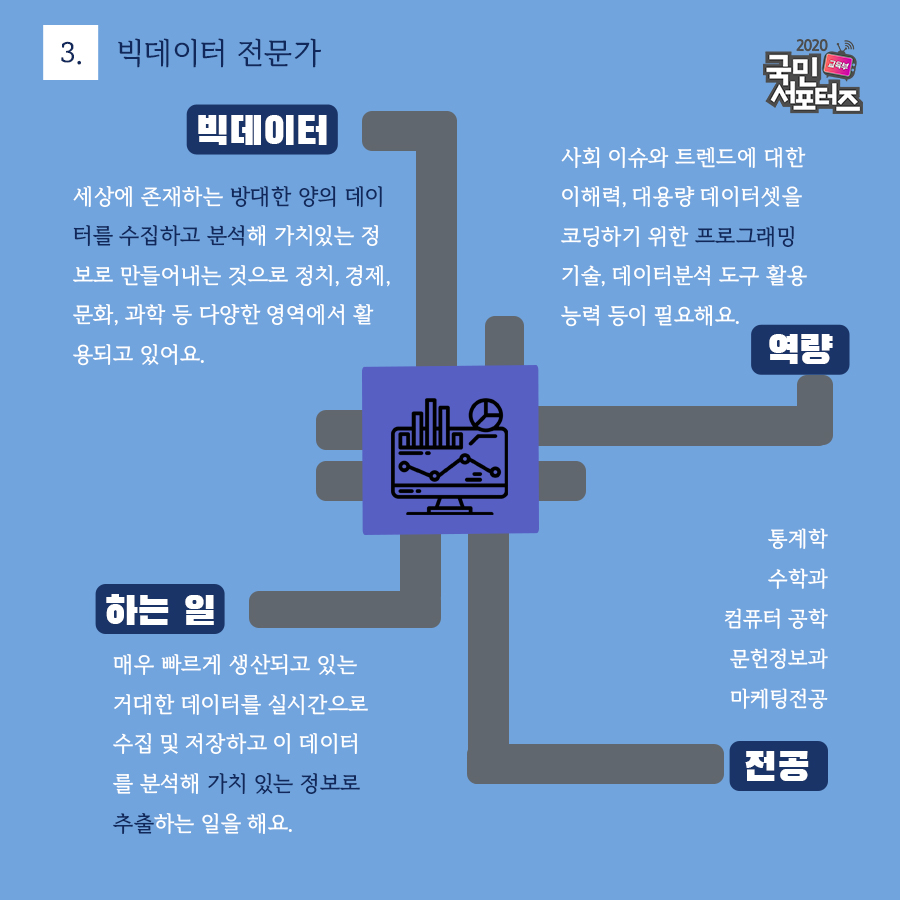 빅데이터 전문가는 매우 빠르게 생산되고 있는 거대한 데이터를 실시간으로 수집 및 저장하고,이 데이터를 분석해 가치 있는 정보를 추출하는 업무를 합니다.