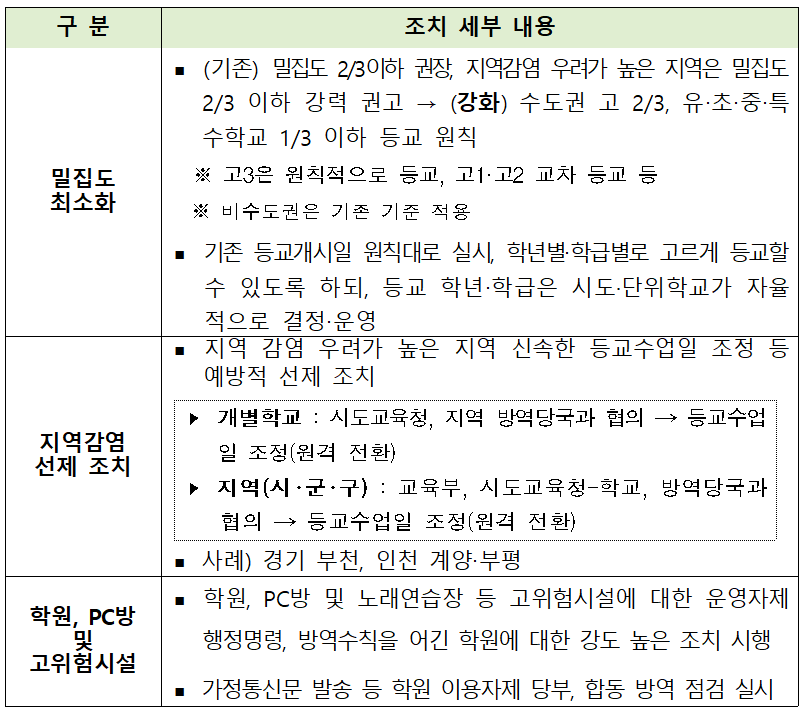 교육부는 방역당국 등 관계부처 협의, 수도권 소재 시도교육감 회의 결과를 바탕으로 수도권 지역 대상, 강화된 학교밀집도 최소화 조치 등 안전대책을 마련했으며, 세부적인 조치의 개요는 아래와 같다.