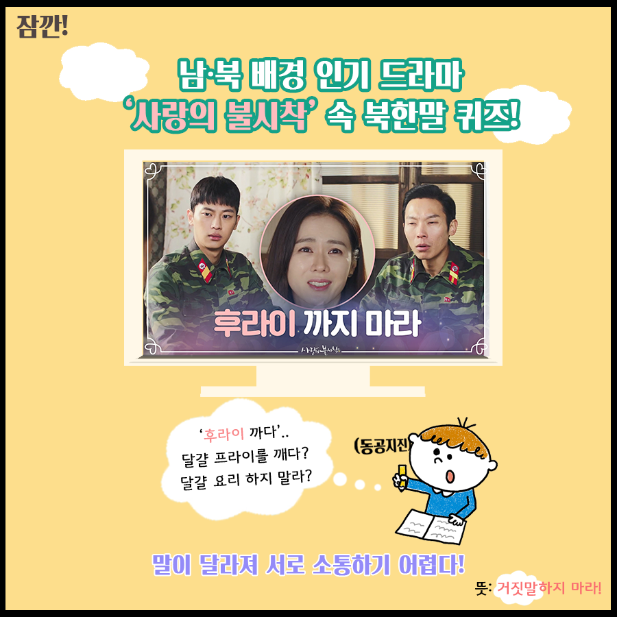 최근 남과 북을 배경으로 한 인기 드라마 ‘사랑의 불시착’ 속 북한말 중에 “후라이 까지 마라!”라는 대사가 나오는데요. 이 말은 어떤 뜻일까요? 후라이 까지 말라는 말은 북한에서 거짓말하지 말라는 뜻으로 자주 사용하는 말이라고 합니다. 이처럼 남과 북의 말이 조금씩 다른 게 느껴지시나요?