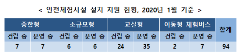ㅇ 교육부는 학생들이 체험 위주의 안전교육과 훈련을 통해안전의식을 고취하고위기 대처능력을 함양할 수 있도록지난 2014년부터 현재까지 전국에 총 94개의 안전체험시설 설립을 지원해왔다.