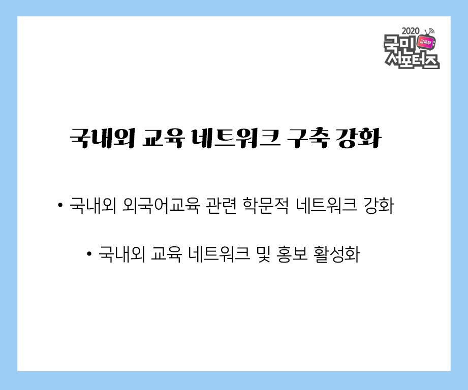 국내외적으로 더 넓은 교육 네트워크를 구축하기 위해 교육부는 먼저 외국어 교육 관련 학술대회를 공동으로 주최하거나 이를 적극적으로 지원해 학계와의 교류를 활성화할 계획입니다. 특히 신남방·신북방국가 학생의 초청연수를 실시하고 2020 GKS(정부초청외국인장학생) 동문초청 연수와 연계하여 특수외국어 전공 학생과 GKS 동문이 1:1로 만날 수 있는 장을 마련할 예정입니다. 더하여, 다양한 박람회를 통해 사업을 홍보하고, 현지 대학 또는 전문가와의 교류를 활성화하고자 합니다.