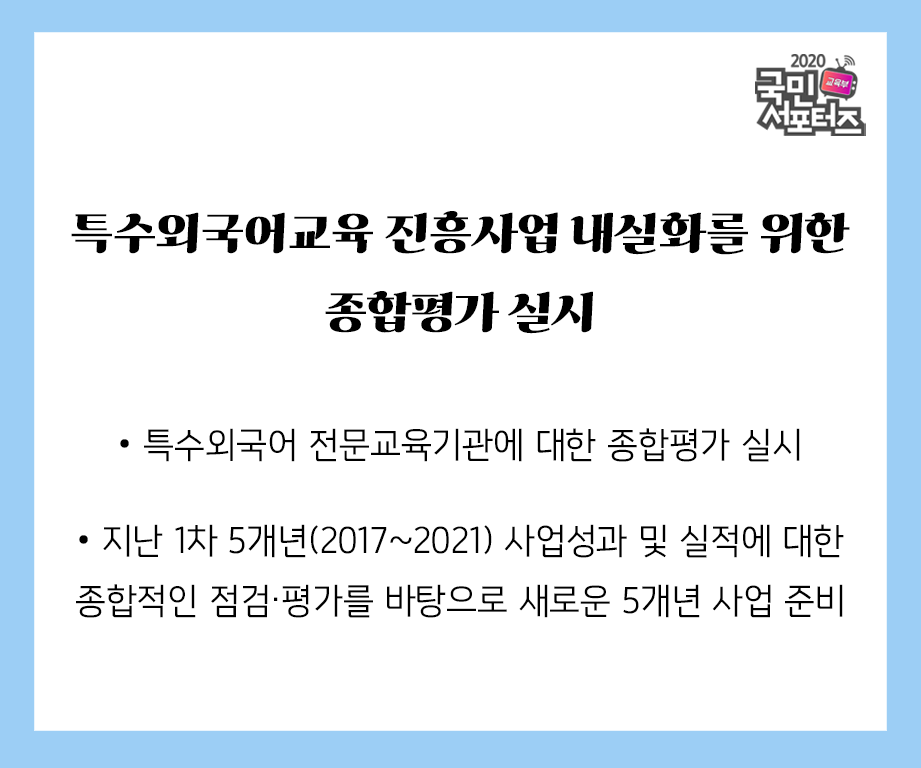 마지막으로 교육부는 특수외국어 전문교육기관에 대한 종합평가를 실시하여 특수외국어교육 진흥사업의 내실화를 꾀하고자 합니다. 교육부는 지난 1차 5개년(2017~2021) 사업 성과를 이어 받아 새로운 5개년 사업을 준비하고 있습니다. 이를 위해 그간의 실적 및 성과를 종합적으로 점검·평가할 예정입니다.