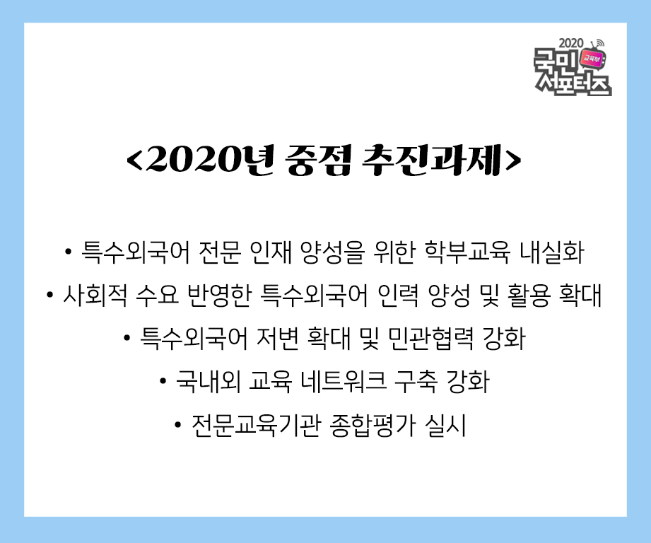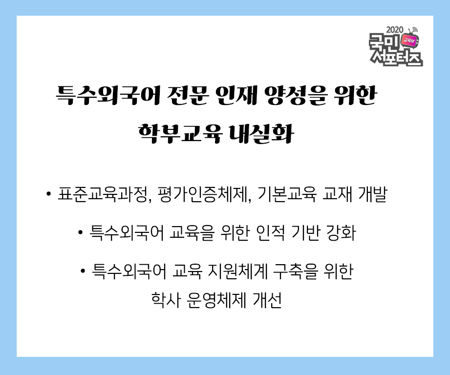※ 참고사항 : 전문교육기관은 특수외국어에 관한 전문성과 교육역량을 갖추고 있는 대학교 중 교육부가 지정한 학교로 2020년 현재 한국외국어대학교, 부산외국어대학교, 단국대학교, 청운대학교가 참여하고 있습니다.