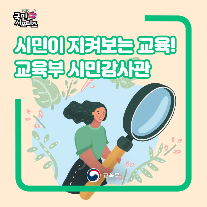 이런 문제점을 보완하기 위하여, 여러 정부 부처에서는 시민의 감시를 받는 제도를 실현하고 있는 추세입니다. 교육부는 중앙부처 최초 대국민 공모 방식으로, 2019년 제1기 시민감사관 제도를 도입하였고, 2020년인 현재 제2기 교육부 시민감사관을 모집하였습니다. 그런데 여기서 드는 한 가지 의문! 시민감사관 제도가 정확히 무엇일까요? 이번 콘텐츠를 통해 시민감사관 제도에 대하여 자세히 알아보도록 하겠습니다.