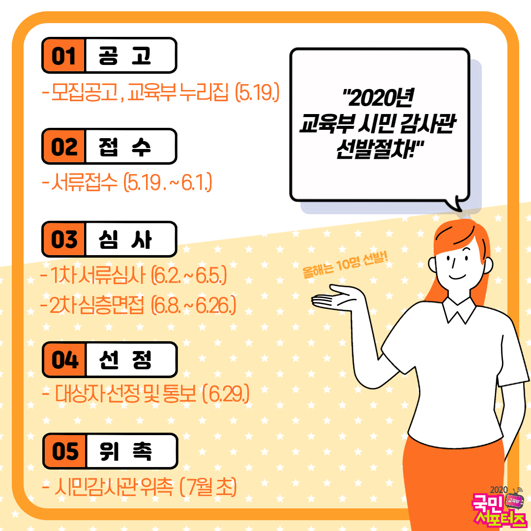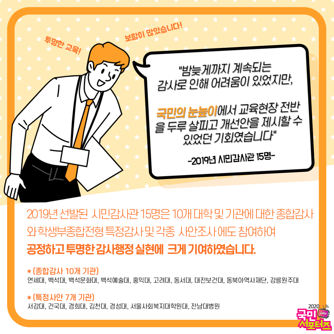 이렇듯 국민 눈높이에 부응하는 투명한 교육행정 구현을 위하여 도입된 시민감사관 제도는 지난 1년간 큰 성과를 올렸고, 앞으로도 감사행정의 밑거름이 될 것으로 예상됩니다. 이에 따라, 교육부에서는 2020년 제2기 시민감사관을 기존 15명에서 20명으로 확대하여 운영할 계획입니다. (※ 연임하는 인원 고려해서 실제 선발하는 인원은 10명 이내입니다)