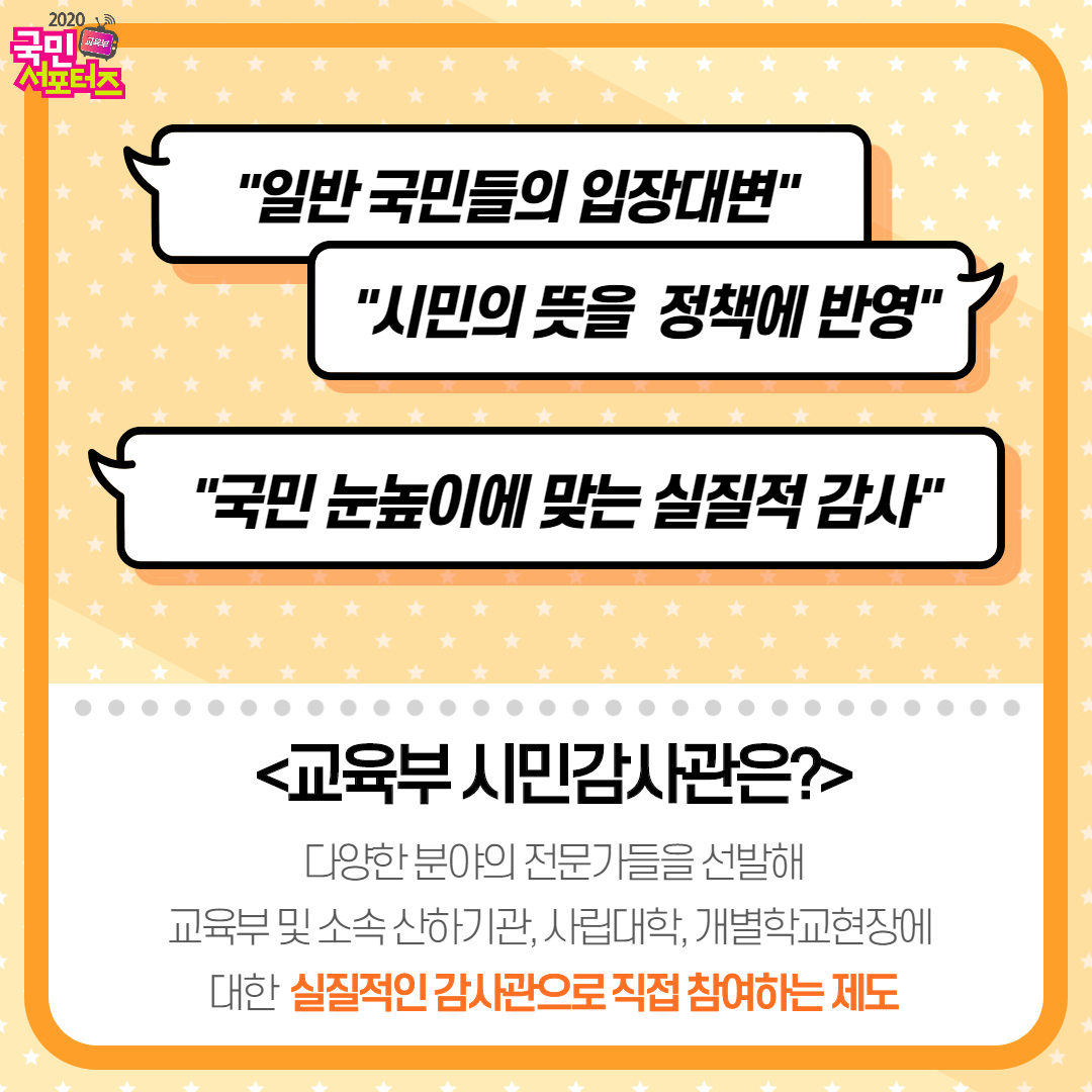 시민감사관 제도란, 다양한 분야의 전문가들이 국민의 시선으로 시민이 직접 정책이 잘 실현되는지, 시민의 뜻이 잘 반영되는지를 감사하는 제도입니다. 대국민 공모 방식을 거쳐 다양한 분야의 전문가들로 시민감사관을 선발합니다. 그 후, 교육부 및 소속 산하기관, 사립대학, 개별 학교 현장에 대한 실질적인 감사관으로 직접 참가하게 됩니다.
