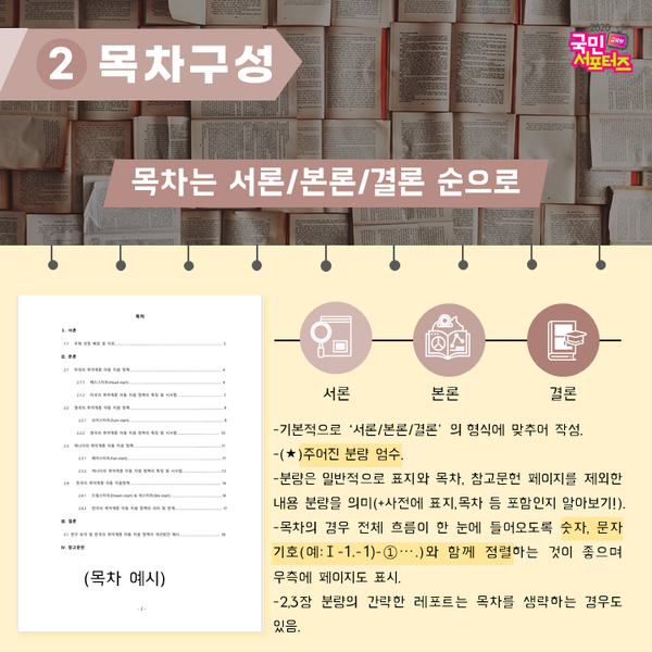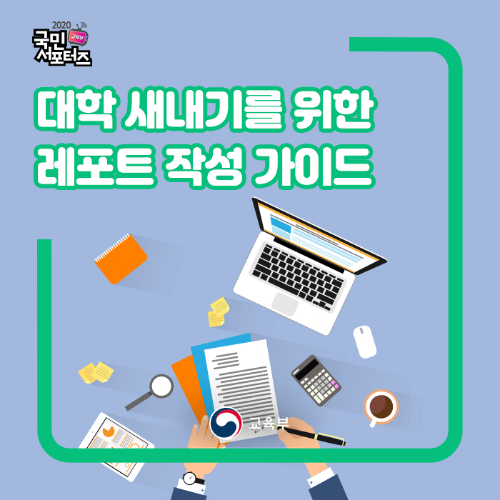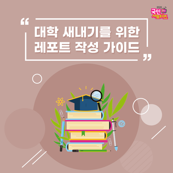 올해 20학번으로 입학한 신입생 친구들은 레포트가 조금은 낯설고 어렵게 다가올 것 같아요. 주제 선정부터 목차, 내용 구성, 그리고 참고문헌까지 신경을 쓸 게 많죠? 또 막상 쓰려고 보니 어떻게 써야 할지 막막하기도 하고 그래서 오늘은 '레포트 작성 가이드'와 선배들의 인터뷰를 기반으로 한 '레포트 꿀팁'에 대해 알려드리고자 해요. 물론 이것이 정답은 아닙니다.무엇보다 내용이 가장 중요하지만, 20학번 새내기 여러분들의 레포트 작성에 대한 궁금증을 해소하고 부담을 덜어드리고자 준비했으니 어렵게 생각하지 마세요~ 그럼 레포트의 늪으로 빠져볼까요?