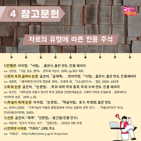 '참고문헌'은 저를 포함한 많은 학생 분이 골머리를 앓는 부분일 것이라고 예상합니다. 그중에서도자료에 따라 인용 주석 표기 방식을 달리한다는 점이 어려워 보이는데요. 그래서 각 자료별 인용 표기법을 간단하게 정리해보았습니다. 단행본, 편저 속의 글이나 논문, 학위/학술지 논문, 그리고 신문이나 인터넷 사이트 등 자료의 유형에 따라 사진 속 형식에 맞추어 각주 ,혹은 미주로 표시하는 것이 좋습니다.