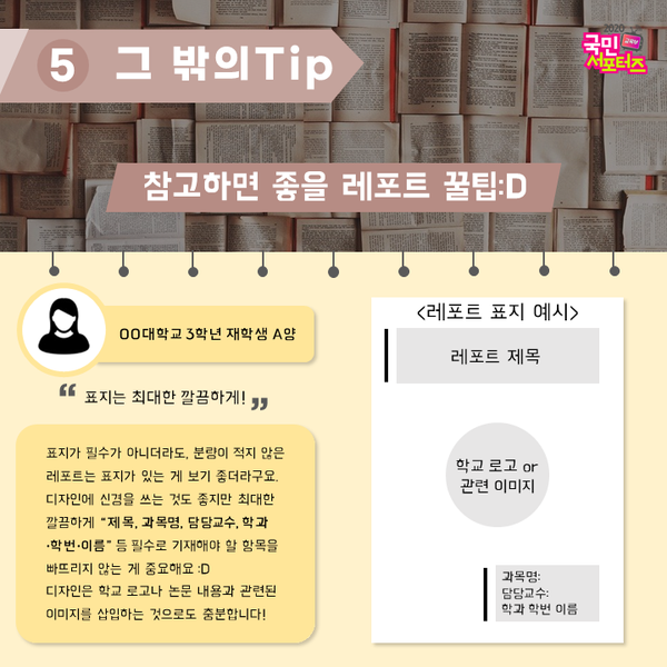 3학년 A양의 꿀팁은 '레포트 표지는 최대한 깔끔하게' 인데요. 지나치게 화려한 디자인보다는 깔끔하고 주요 내용이 누락되지 않은 표지를 준비하는 것이 좋다고 합니다. 특히 "레포트의 제목, 과목명, 담당 교수님 성함, 학과/학번/이름" 등의 내용이 포함되어야 교수님께서도 레포트에 대한 정보를 한눈에 알아보실 수 있겠죠? 표지가 밋밋해 보인다면 학교 로고 이미지나 레포트 관련 이미지를 활용해 레이아웃을 짜는 것도 깔끔해 보인다고 해요!