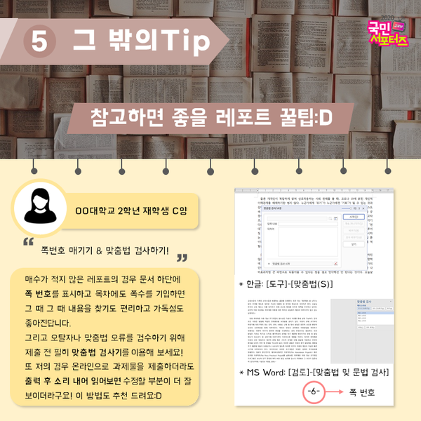2학년 재학생 C양은 '쪽 번호 매기기&맞춤법 검사하기'를 꿀팁으로 꼽았습니다. 매수가 적지 않은 레포트의 경우 페이지 하단에 쪽 번호를 표시하고 목차에도 이를 포함하면 내용을 찾기에도 편리하고 가독성도 높여줄 수 있다고 해요. 또한 오탈자나 맞춤법 오류를 검수하기 위해 제출 전 문서 내의 '맞춤법 검사기' 프로그램을 이용하는 방법을 추천한다고 합니다. 한글 문서의 경우엔 [도구]-[맞춤법(S)], 워드 문서의 경우 [검토]-[맞춤법 및 문법 검사] 탭의 경로를 통해 맞춤법을 검사해 볼 수 있습니다. 또한 제출 전 종이로 출력하여 소리 내 읽어보는 것도 수정할 부분을 발견하는 데 용이하다고 합니다.