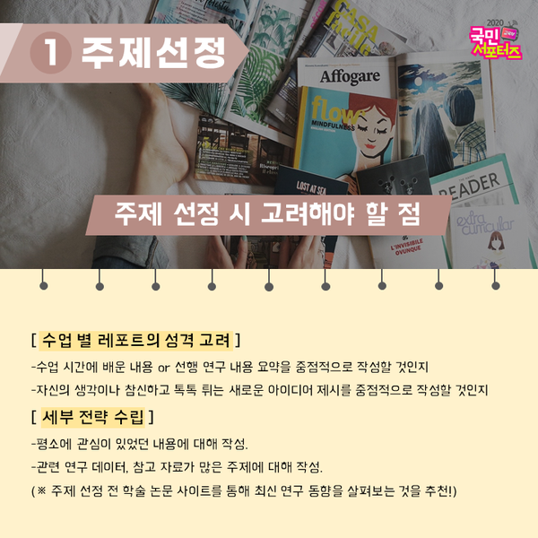 가장 먼저 주제 선정!간혹 특정 주제를 정해주시는 경우도 있지만,자유 주제인 경우 주제 선정 시 고려해야 할 점이 몇 가지 있답니다. 먼저 수업의 특성 등을 고려해 레포트의 방향성을 잡는 것이 중요한 포인트입니다.