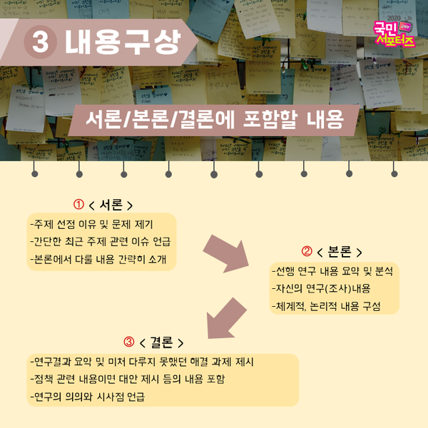 이렇게 큰 틀을 잡은 뒤에 세부 계획을 수립해야 합니다.이는 자유롭게 어떤 주제가 좋을 지 고민해보는 단계로 평소 관심을 갖고 있던 분야에 대해 작성하거나 관련 연구 데이터 및 참고 자료가 풍부한 주제에 대해 작성하면 보다 수월하게 글을 써 내려 갈 수 있습니다.