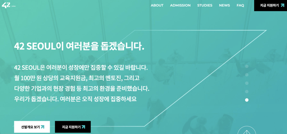 42 SEOUL(42 서울)은 정부가 2019년에 설립한 이노베이션 아카데미 재단의 첫 번째 교육 프로그램으로, 혁신적인 소프트웨어 인재 양성을 목적으로 합니다. 소프트웨어 인재 양성, 새로운 교육 시스템의 개발, 소프트웨어 개발자 생태계 활성화를 목표로 삼고 있습니다. 커리큘럼은 C 언어 프로그래밍과 기본적인 프로그래밍 개념을 기반으로 시작하여 스스로 운영체제, 그래픽 및 웹 프로그래밍을 학습합니다. 매년 반기별 약 250명, 연 약 500명 수준으로 선발되며, 온라인 테스트를 통과한 지원자는 체크인, 에세이과정을 거쳐 La Piscine(1개월 집중교육)과정을 참여하게 됩니다. La Piscine 과정을 거쳐 최종 선발된 교육생은 약 2년 간 본 과정에 참여하게 됩니다. 42 SEOUL에서 키운 개발 역량을 바탕으로 창의적이고 혁신적인 사업을 하기 위해 창업을 할 수 있으며, 스타트업부터 글로벌 기업에 이르기까지 소프트웨어 생태계의 모든 일자리에 지원할 수 있습니다.