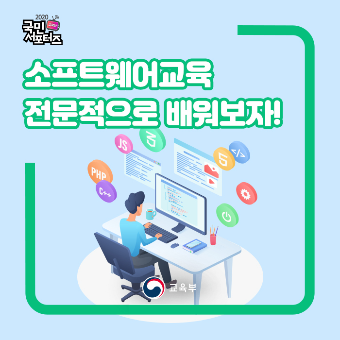 대학, 학원, 기업 등 다양한 곳에서 소프트웨어 교육이 이루어지고 있습니다. 소프트웨어가 필수교육으로 자리 잡게 된지 3년이 지났고, 현재 모든 초·중학교에서도 소프트웨어 교육(코딩 교육)을 실시하고 있습니다. 2020년 교육부 업무계획에 의하면 모든 초·중학교에 소프트웨어교육 의무화를 완료하고 AI교육으로 전환을 준비하여 AI·첨단 분야 인재 양성을 목표로 함을 알 수 있습니다. 더욱 자세한 내용은 다음 교육부 업무계획에서 확인할 수 있습니다!