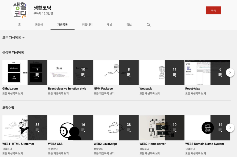 모든 동영상 강의는 Youtube를 통해 서비스되고 있으며, HTML & Internet을 시작으로, CSS, JavaScript, Python, PHP, MySQL, Ajax 등에 대한 학습을 진행할 수 있습니다.