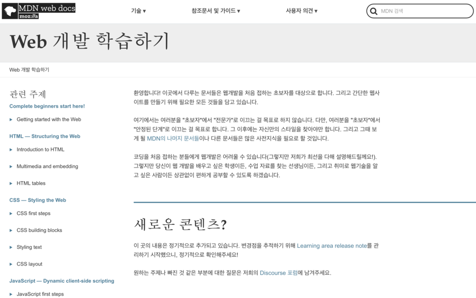 MDN Web Docs는 웹 기술과 웹을 더 강력하게 만들어주는 소프트웨어를 배우기 위해 끊임없이 발전하는 학습 플랫폼입니다. CSS, HTML, JavaScript와 같은 웹 표준, 열린 Web을 위한 애플리케이션 개발, Firefox 부가 기능 개발과 같은 주제를 다루고 있습니다. 본인의 개발능력에 따라 어디서 시작해야 할지 실용적인 정보를 제공하고 있습니다.