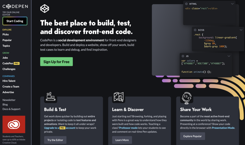 CodePen은 온라인 커뮤니티 상에서 HTML, CSS, JavaScript 코드를 테스트하고 서로 공유할 수 있습니다. 웹 코딩에 있어 소스코드에 대한 정보를 얻을 수 있으며, 본인이 연습한 것을 다른 사람에게 자문을 얻거나. 다른 사람들이 구현한 코드를 참고할 수 있습니다. 프론트엔드 코드를 제작하고, 테스트를 하기 위한 최적의 환경을 제공합니다.