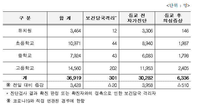 * 등교 후 확진자는 학교 내 감염된 것이 아니라, ① 등교 이후 확진자의 접촉자로 밝혀지거나, ② 무증상으로 등교하였으나 학교에서 증상이 발현되어 보건당국의 검사를 통해 확진자임을 통보받은 자