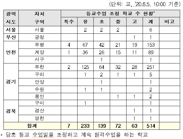 ㅇ 6.5.(10시 기준), 5개 시·도 514개 학교가 등교 수업일 조정 중