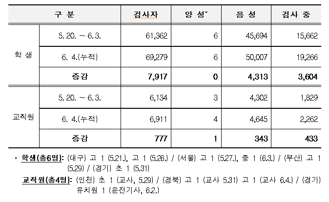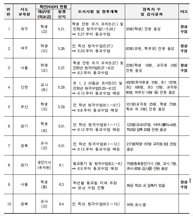 - 6.4.(목) 16:00 기준, 등교 후 확진자 교직원 1명 추가, 누적 10명(학생 6명, 교직원 4명)