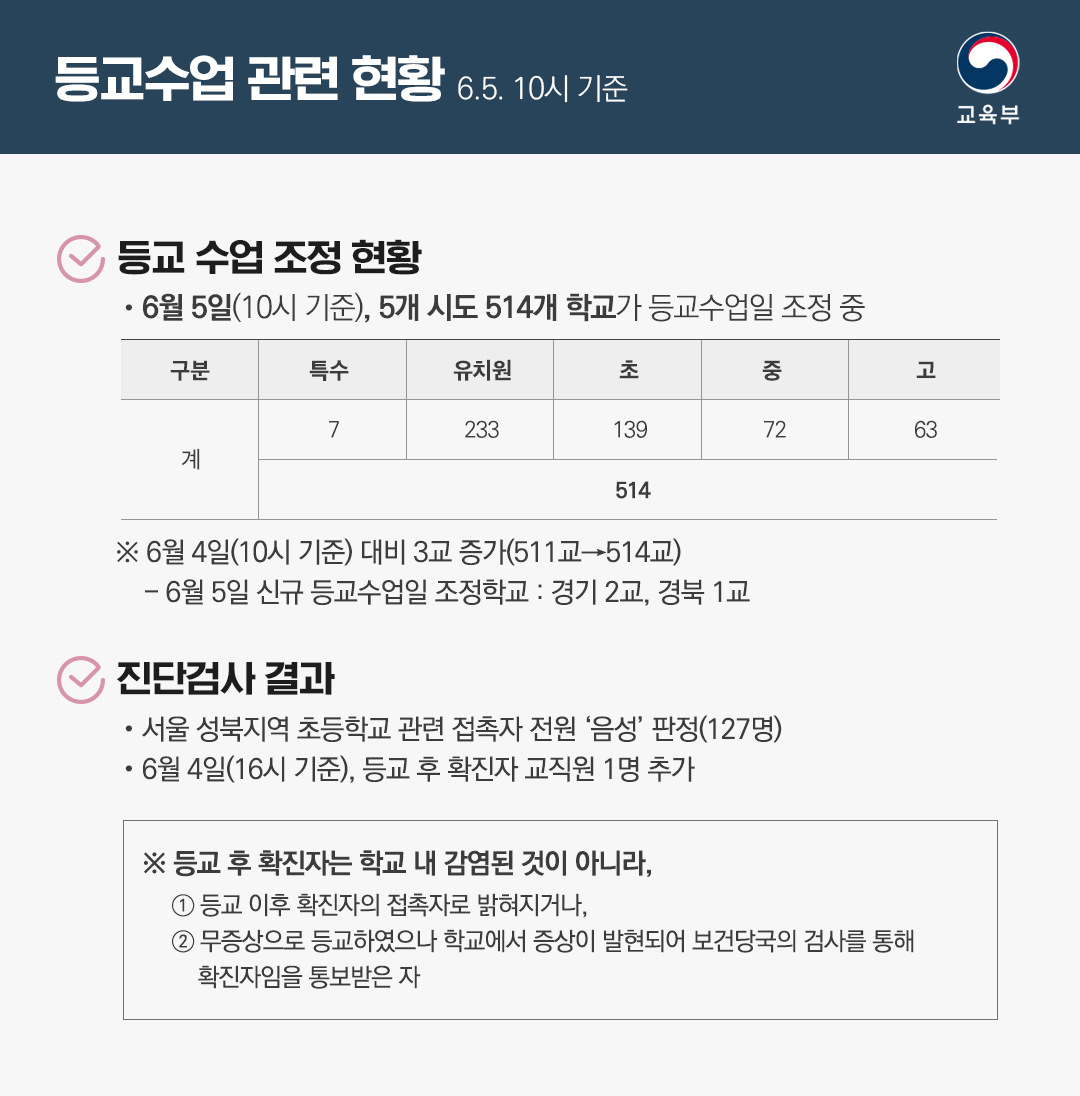 - 6월 5일 10시 기준, 5개 시도 514개 학교 등교수업일 조정 중