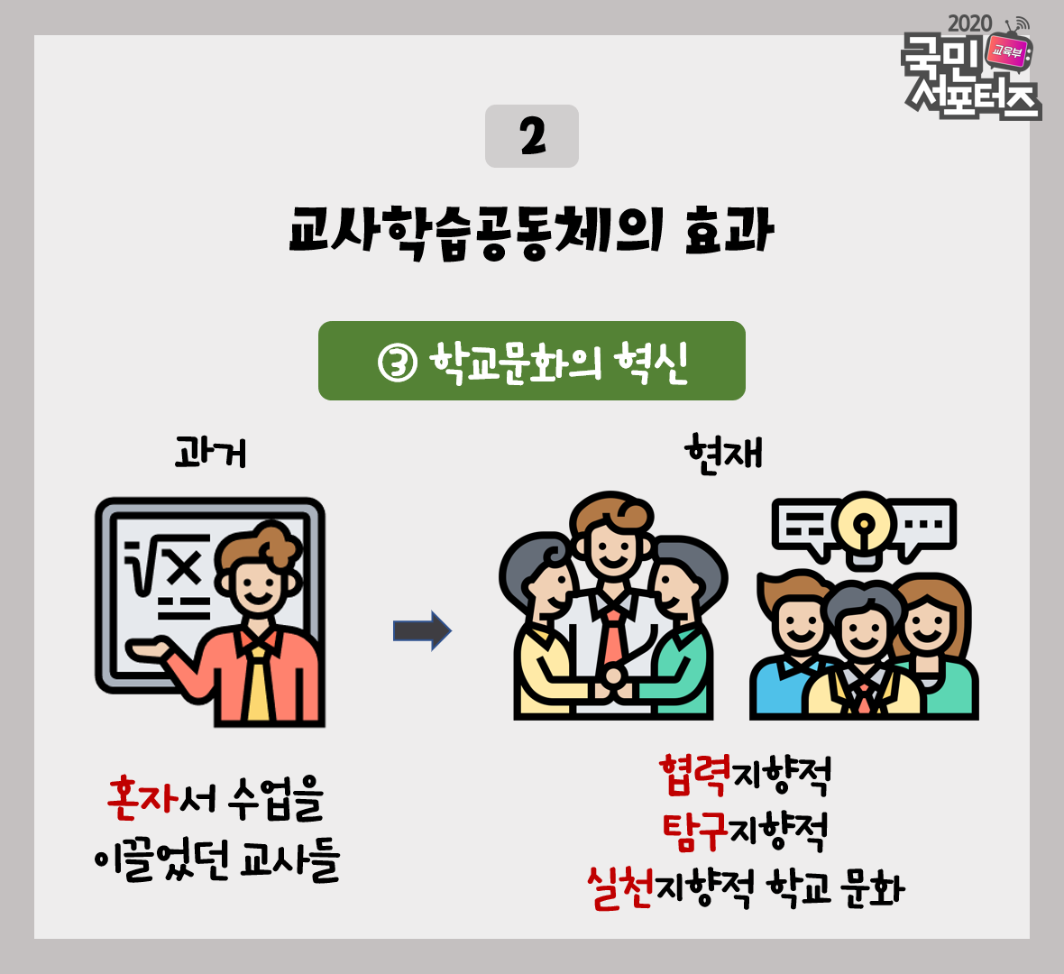 새로운 아이디어와 새로운 도전을 존중하는 교사학습공동체의 활발한 운영은 탐구지향적, 실천지향적, 협력지향적인 학교 문화를 확산시키고 기존 교육의 혁신과 변화의 요구로 이어집니다.
