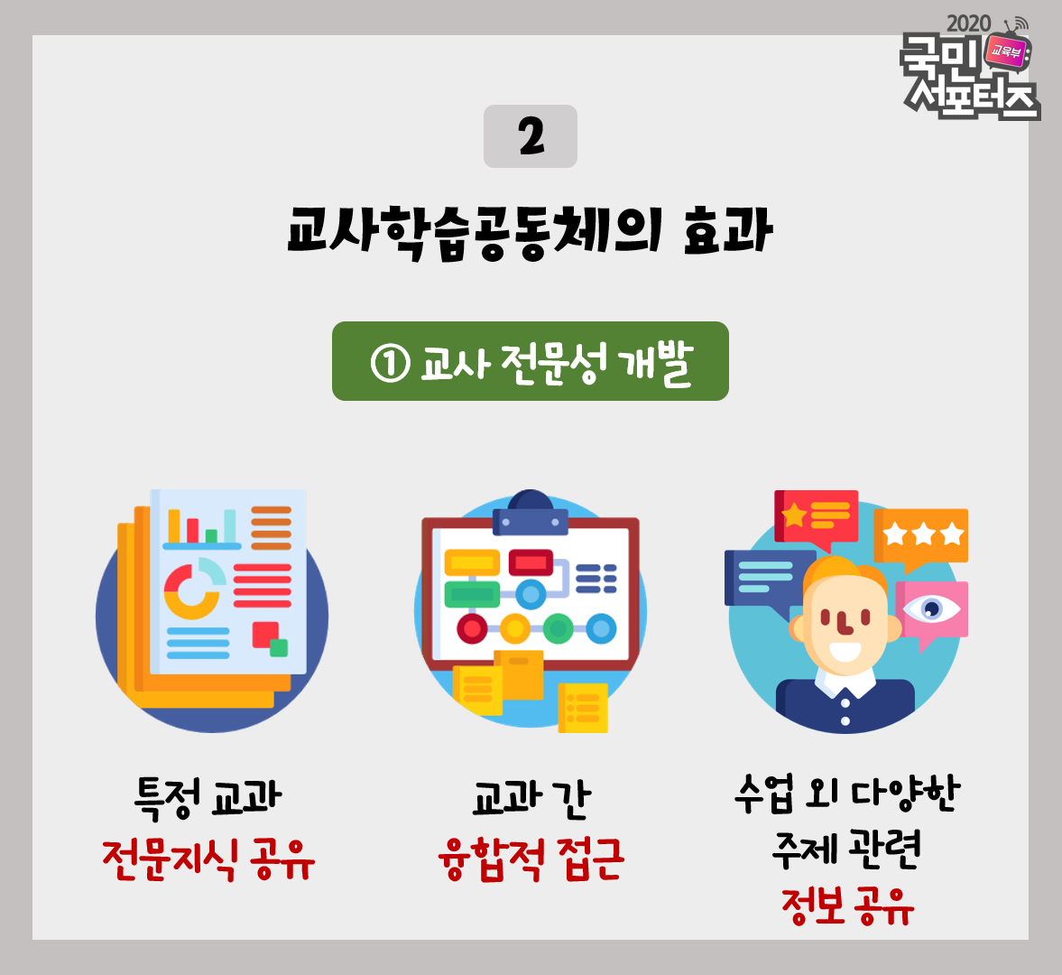 교사들은 학습공동체를 통해 자신이 맡은 특정 교과에 대한 전문 지식을 공유함으로써 교과교육 전문성을 향상시킬 수 있습니다. 수업에서 활용하는 다양한 교육 콘텐츠와 실천 경험, 교육과정 운영에서 겪는 어려움을 공유하면서 수업 기획과 운영의 발전을 도모할 수 있으며 교사 개인의 성장을 이끌어 낼 수 있습니다.