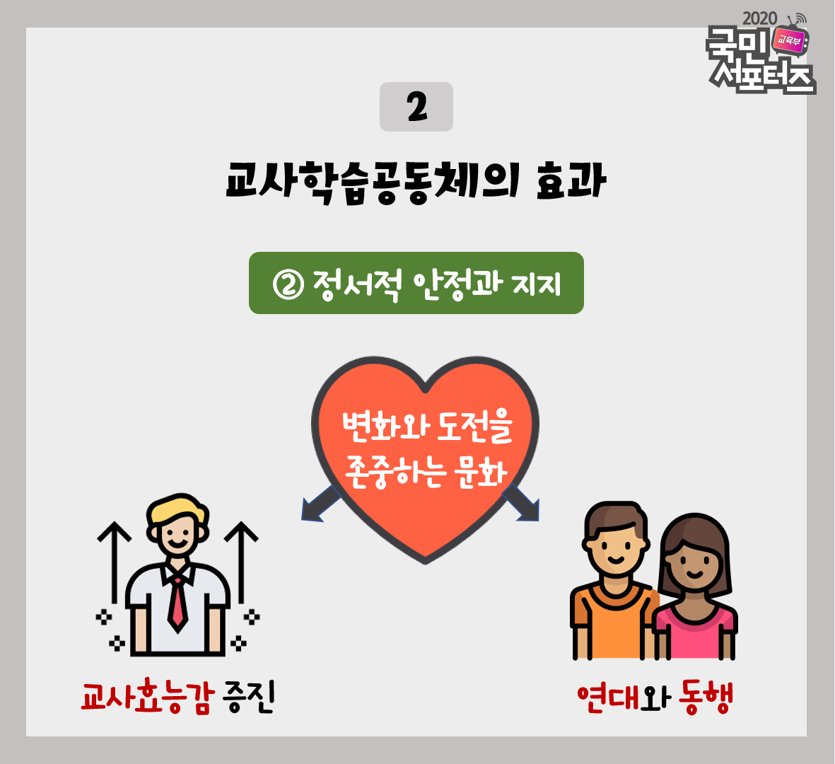 또 교사들은 학습공동체를 통해 수업 기술이나 교수 방법, 그리고 자료를 공유하는 것에 그치지 않고 교육에 대한 열정과 가치를 공유할 수 있습니다. 변화를 향한 도전과 열정을 존중하는 문화와 분위기에서 교사들은 공감대를 형성하여 연대와 동행이라는 큰 가치를 얻을 수 있습니다.