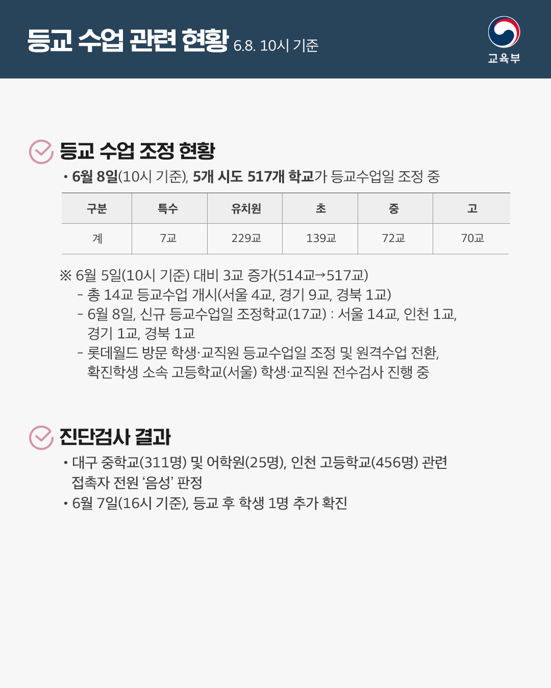 - 6월 8일, 5개 시도 517개 학교가 등교수업일 조정 중