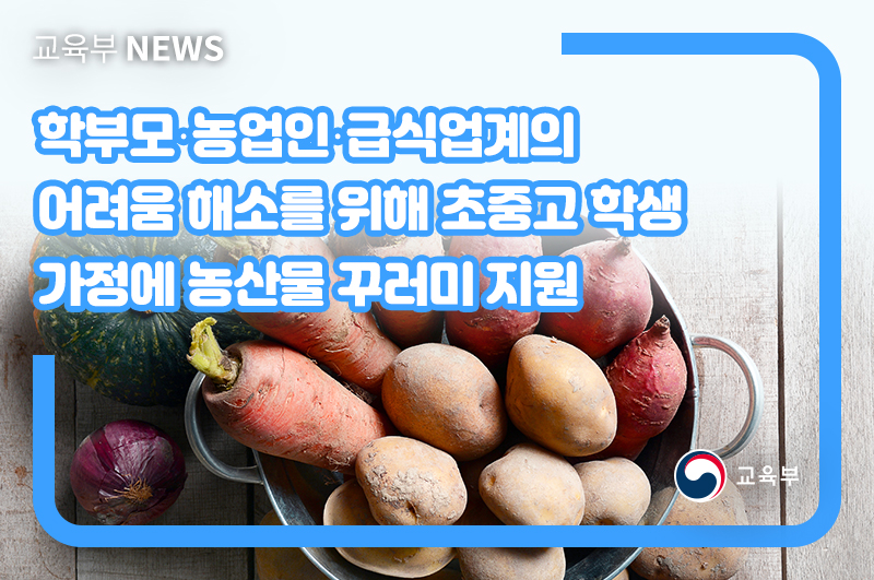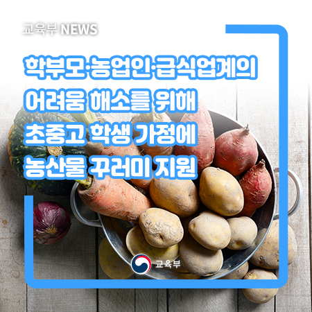 교육부(부총리 겸 교육부장관 유은혜)와 농림축산식품부(장관 김현수, 이하 농식품부)는 학교급식의 중단으로 인해 학부모, 농가 및 급식업체의 부담이 증가함에 따라 시도교육청·지자체와 협력하여 ‘학생 가정 농산물꾸러미 지원사업(이하 꾸러미사업)’을 추진 중이다.