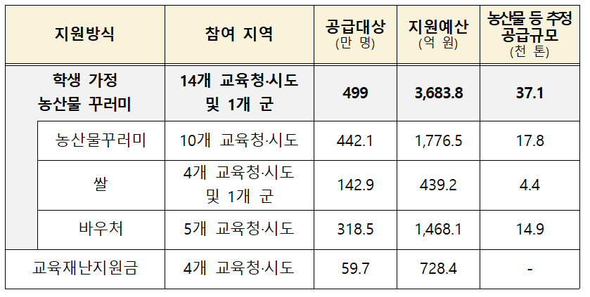 * 세종은 ‘학생 가정 농산물꾸러미’ 공급과 교육재난지원금 지급 병행