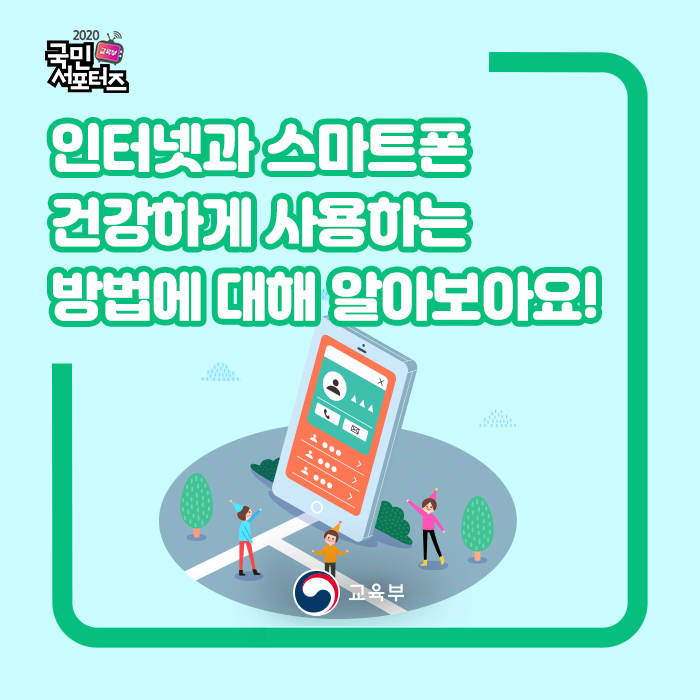 교육에 필수적으로 자리 잡은 인터넷과 스마트폰! 지금은 인터넷과 스마트폰을 피할 수 없는 시대에 와 있습니다. 특히 교육을 받는 우리 학생들에게는 더더욱 그렇습니다. 물고기를 주는 대신 잡는 방법을 알려주라는 말 다들 알고 계시죠? 물고기를 주기만 하는 교육이 아닌 잡는 방법을 알려주는 교육이 필요합니다. 인터넷과 스마트폰 건강하게 사용하는 방법에 대해서도 교육이 필요한 시점입니다.