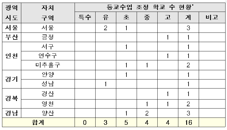 - 6.11.(목) 10:00 기준 20,902교 중 16교(0.08%) 등교수업일 조정