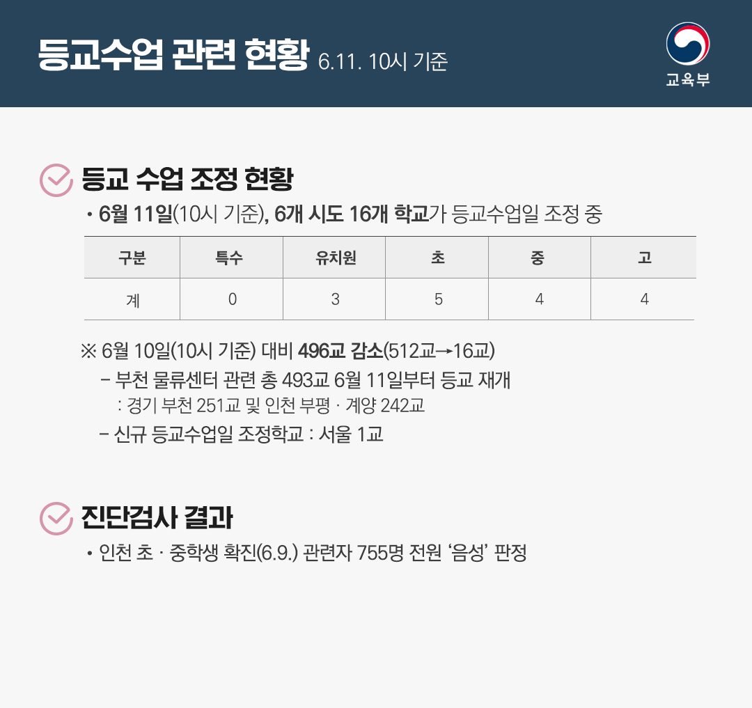 - 부천 물류센터 관련 총 493교 6월 11일부터 등교 재개