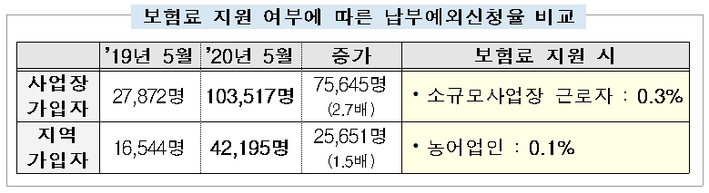 그러나, 보험료가 지원되는 10인 미만 소규모 사업장 근로자(143만 명) 중 납부예외신청자는 0.9%에 그쳤고, 농어업인 보험료 지원 대상 26만 명 중 납부예외를 신청한 비율은 0.1% 수준으로 나타났다. 즉, 보험료를 지원받는 경우 코로나19로 인해 소득이 일부 감소했더라도 납부예외를 신청하지 않는 것으로 드러났다.