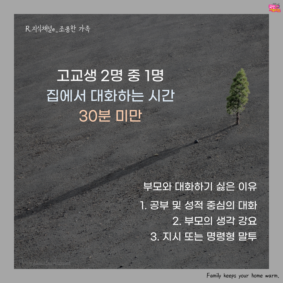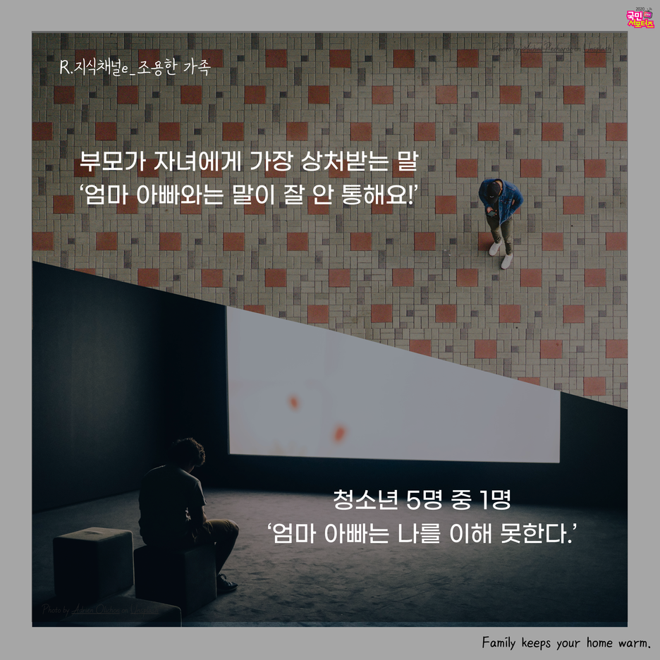 고교생2명 중1명꼴로 집에서 대화하는 시간이30분이 채 되지 않는다고 합니다.공부 및 성적 중심의 대화,부모의 생각 강요,지시 또는 명령형 말투 때문에 부모와의 대화를 꺼린다고 하는데요.청소년5명 중1명은 부모가 자신을 이해하지 못한다고 말하며,부모는 자녀에게 말이 잘 통하지 않는다는 말을 들으면 상처를 받는다고 합니다.이처럼 평소 우리는 서로에게 상처를 주고 상처를 받으며 대화가 사라져만 갔습니다.
