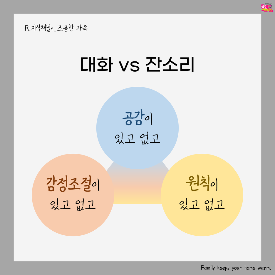 대화와 잔소리는 분명 다르다는 것 알고 계시죠?대화와 잔소리는 공감,감정조절,원칙의 유무에 따라 구분될 수 있다고 합니다.오늘부터는 잔소리가 아닌 차근차근‘대화’를 시도해 보는 건 어떨까요?