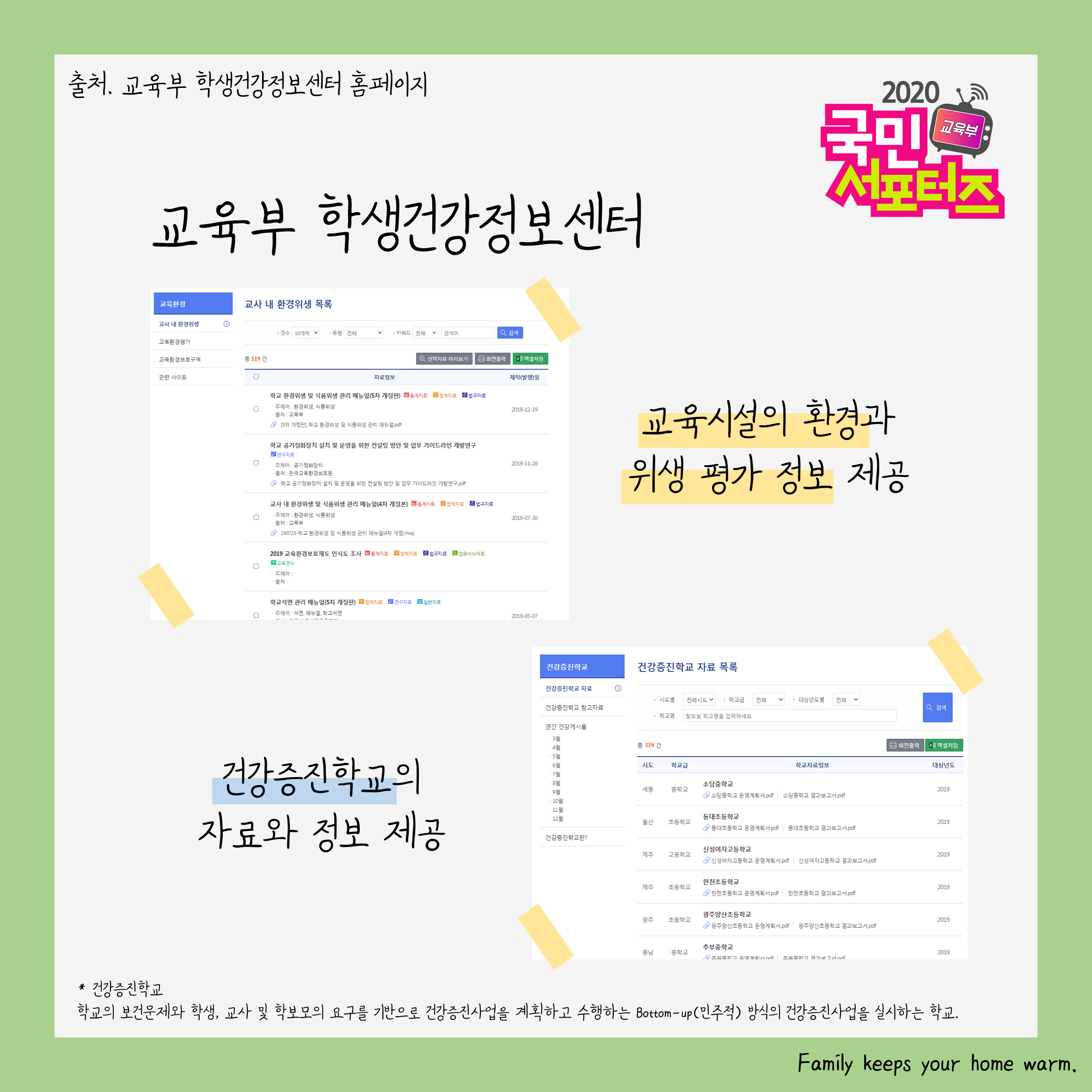 교육부 학생건강정보센터에서는 자녀들이 이용하게 될 교육시설의 환경과 위생 평가 정보를 제공하고 있어 아이들이 가장 오랜 시간 머무르는 교육현장에 대해 보다 나은 이해를 도울 수 있습니다!또한 학교의 보건문제와 학생,교사 및 학부모의 요구를 기반으로 건강증진사업을 계획하고 수행하는Bottom-Up(민주적)방식의 건강증진학교 자료와 정보도 제공하고 있으니 자녀들이 머무르는 공간에 대해 더 다양하게 살펴볼 수 있겠죠?