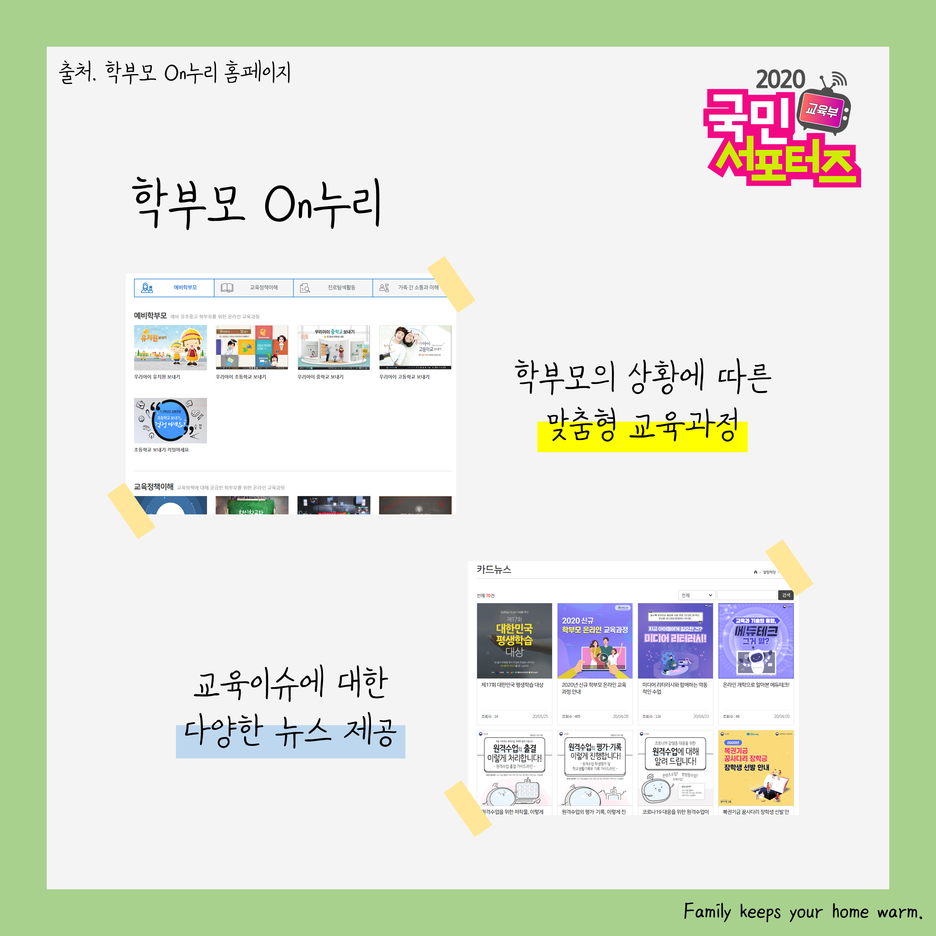 특히 학부모On누리에서는 예비 학부모부터 자녀의 초·중·고 진학까지 학부모의 상황에 따른 맞춤형 교육과정을 제공하기도 하며 평소 궁금했지만 막상 찾아보기는 어려움이 있었던 교육이슈에 대한 다양한 뉴스들도 제공하고 있습니다.