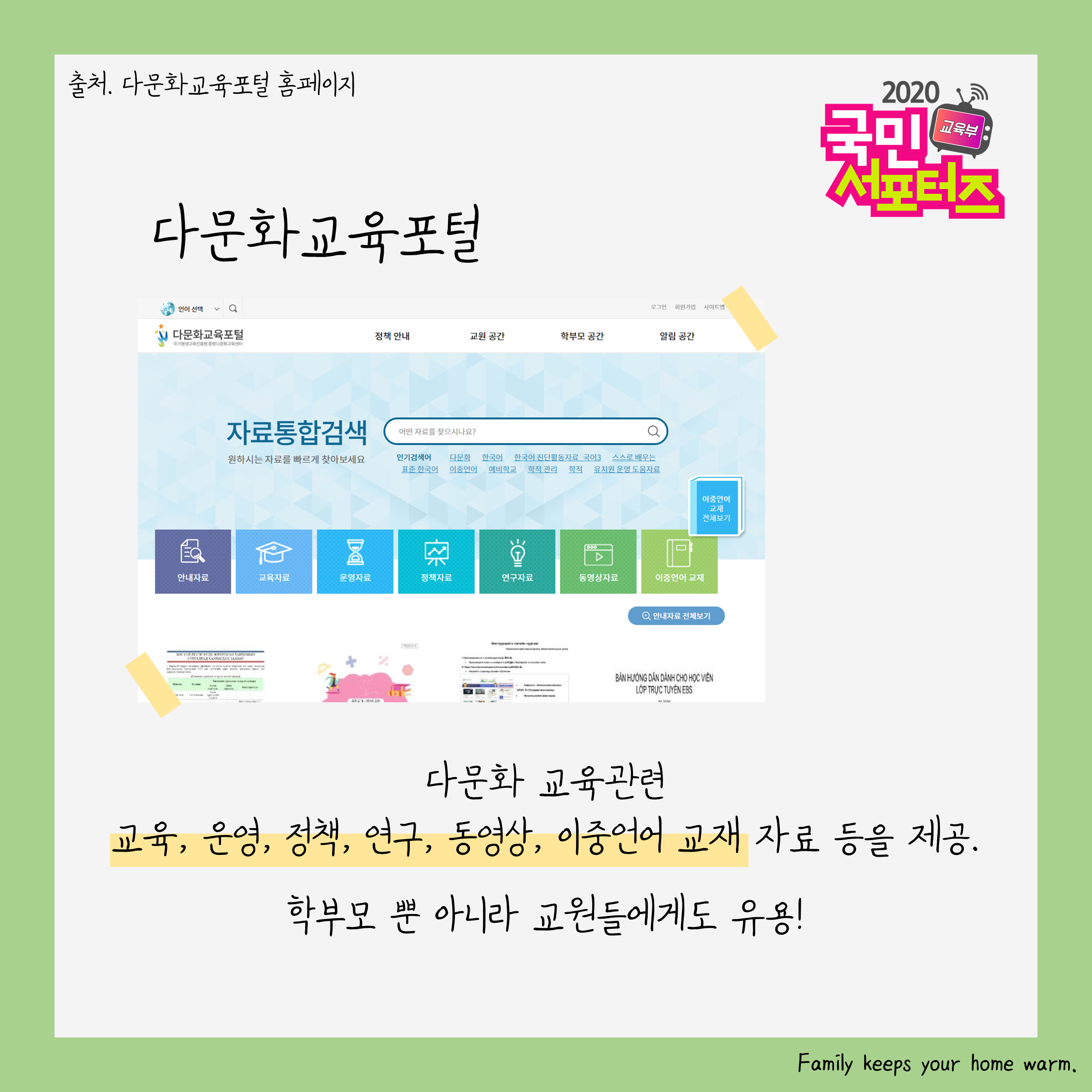 두 번째는‘다문화교육포털’입니다.우리 가족이 다문화 가족이라면?생각보다 다양한 부분에서 어려움이 발생할 것입니다.특히,자녀에게 어떤 교육을 제공해야할지 어려움이 발생하는데 그럴 때는 다문화 교육포털을 이용해보세요!다양한 교육 자료부터 운영과 정책 자료를 살펴볼 수 있으며 동영상을 비롯한 이중 언어 교재까지 제공받아볼 수 있습니다.학부모 뿐 아니라 교원들에게도 유용하겠죠?