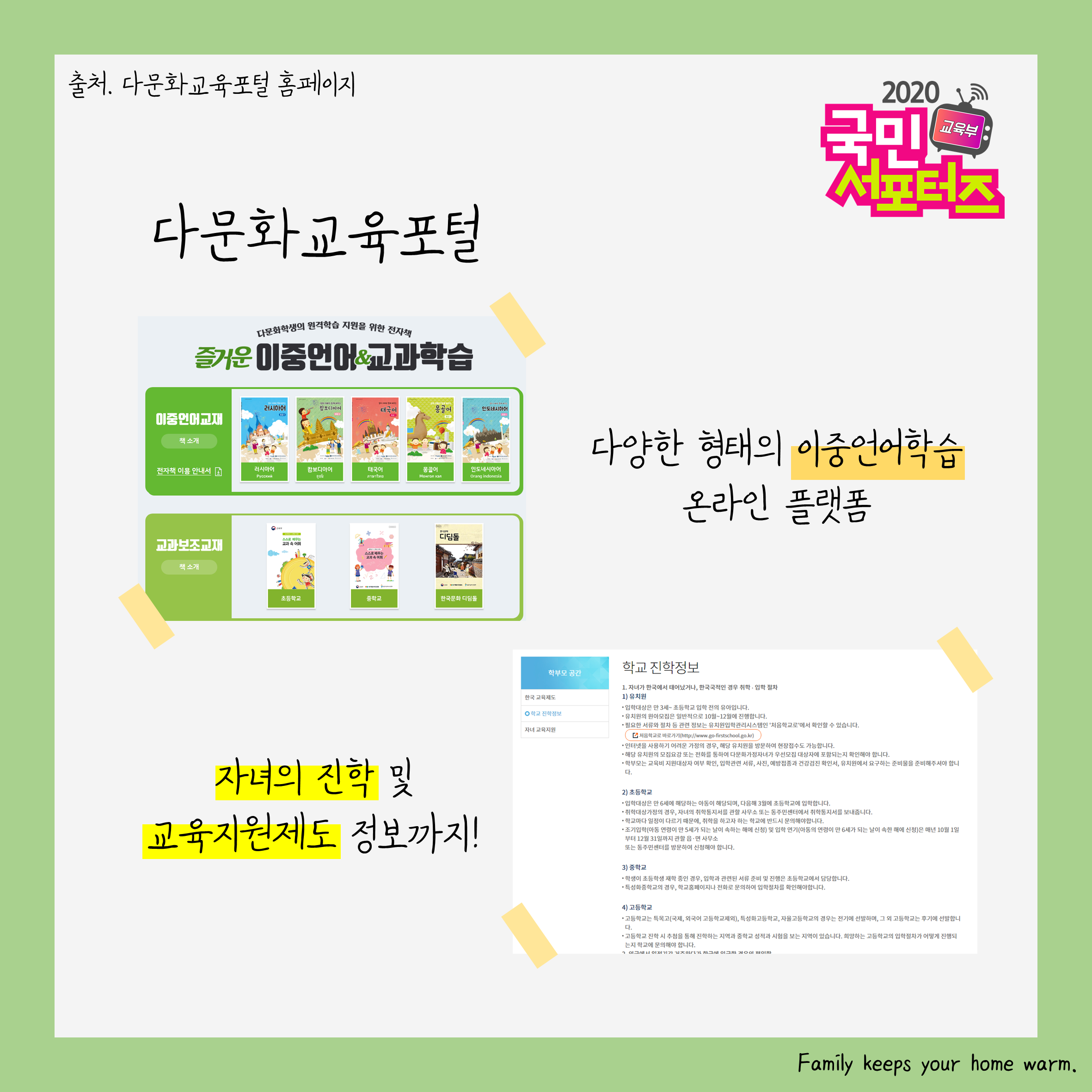 더불어 다문화 교육포털은 이중 언어학습에 대해 다양한 형태로 플랫폼을 만들어놓았다는 것이 특징이며 실질적으로 도움이 될 자녀의 진학부터 교육지원제도에 대한 정보까지 집대성되어있답니다.