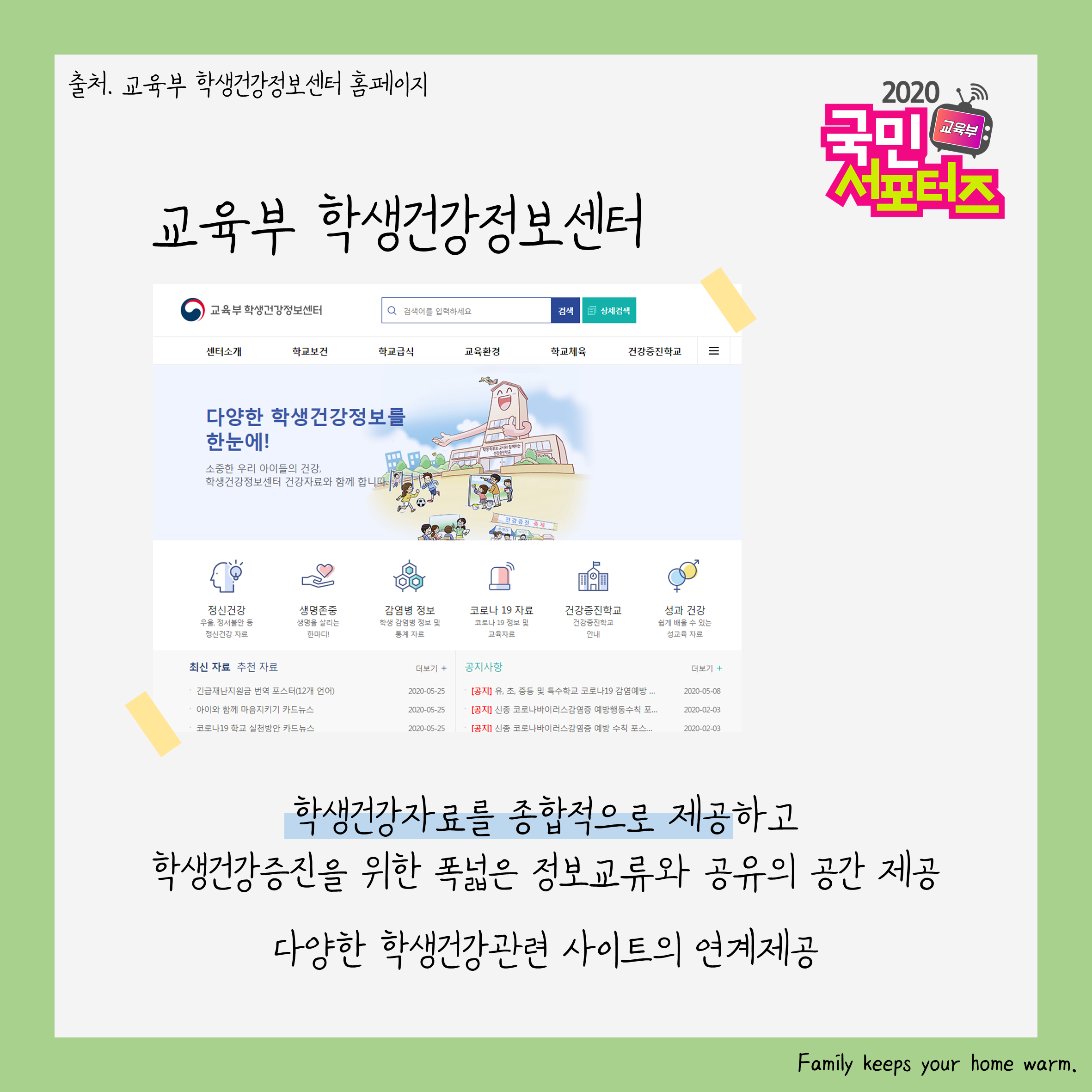 마지막은‘교육부 학생건강정보센터’입니다.좋은 관계를 위해서는 무엇보다 몸과 마음이 건강해야겠죠?학생건강정보센터에서는 다양한 학생건강증진을 위한 정보를 제공하고 있어 건강에 관한 다양한 정보를 얻을 수 있습니다.
