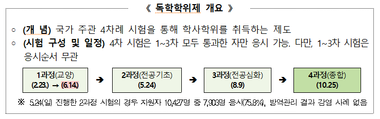 - 지방공무원(교육행정 등) 8·9급 신규임용시험, 독학학위제 1과정 시험, 영재학교 2단계 입학전형 관련 방역 관리 철저