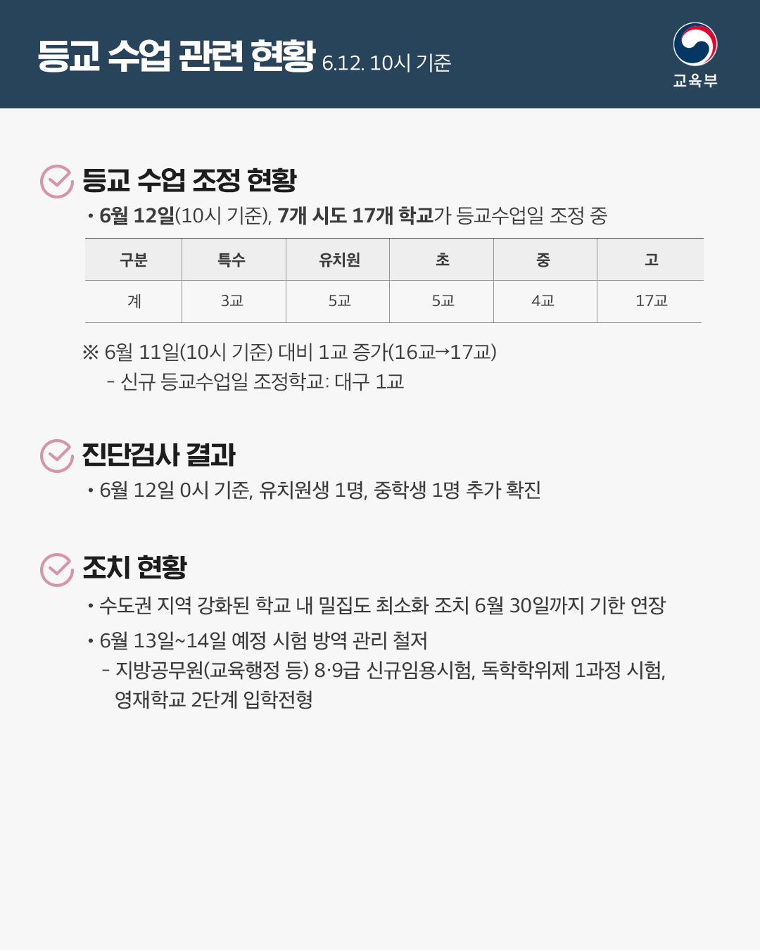- 6월 12일(10시 기준), 7개 시도 17개 학교가 등교수업일 조정 중