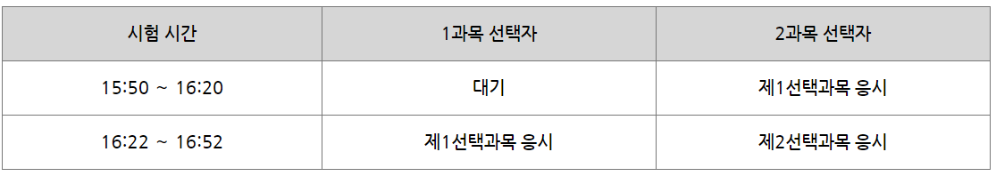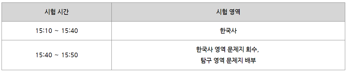 한국사 영역 시험 시간 종료 후 한국사 영역 문제지 회수 및 탐구 영역 문제지 배부 시간을 10분 부여한다(탐구 영역 미선택자는 대기실로 이동 가능).