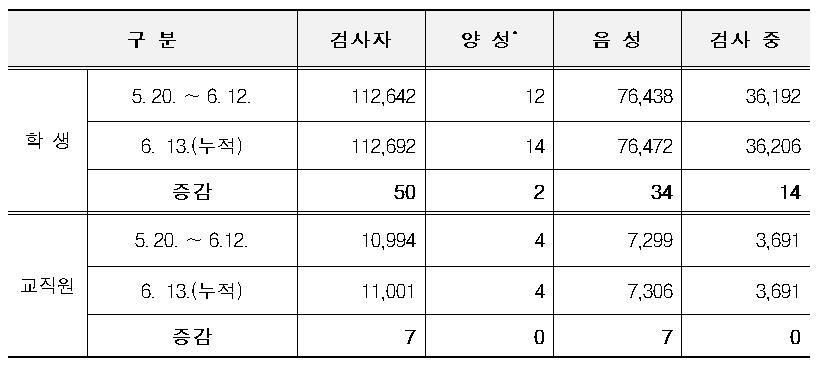 등교 이후 진단검사 현황 (6.14. 16시 기준)